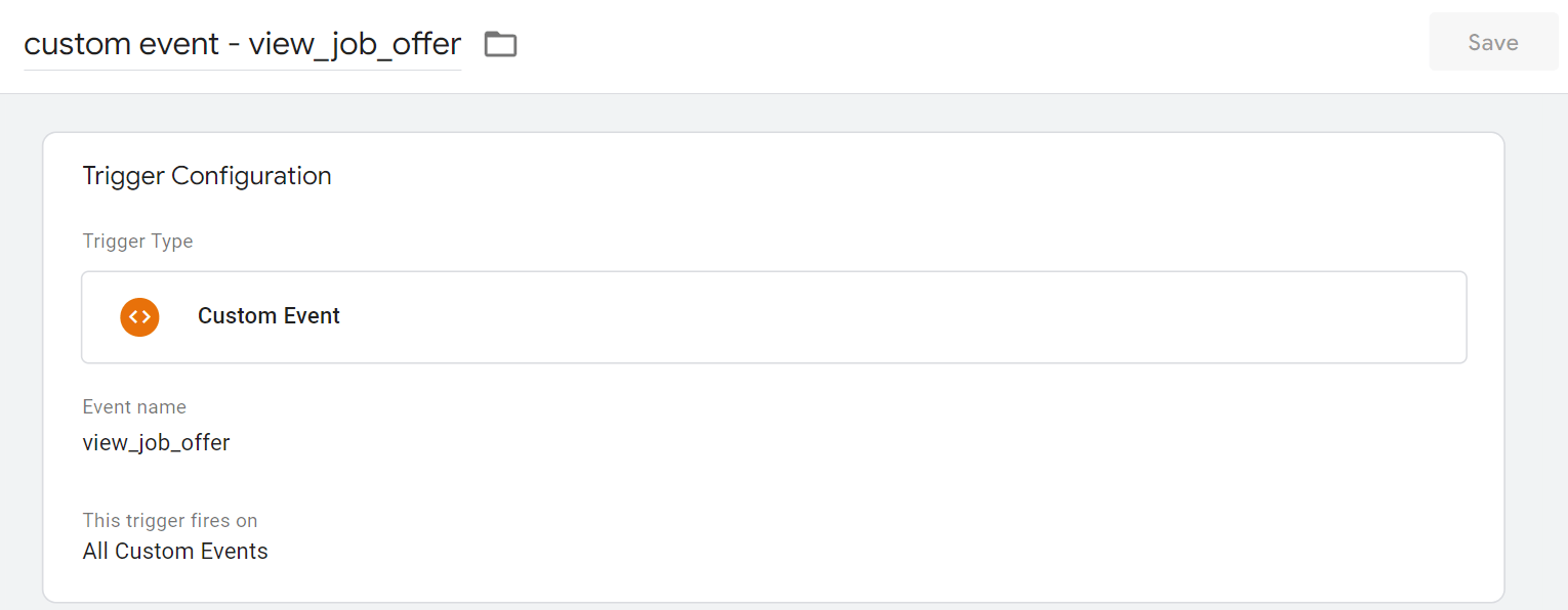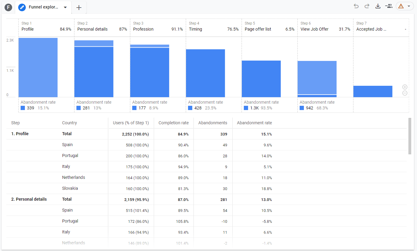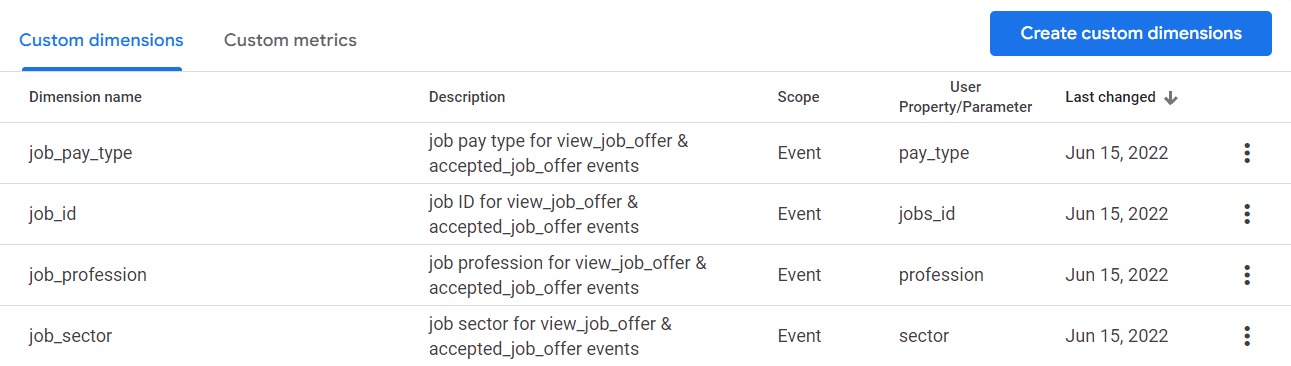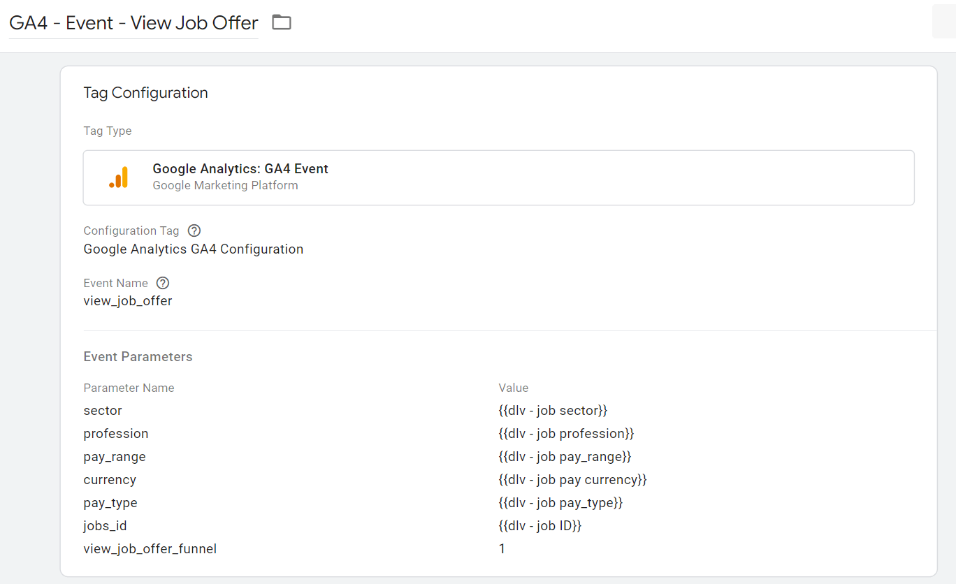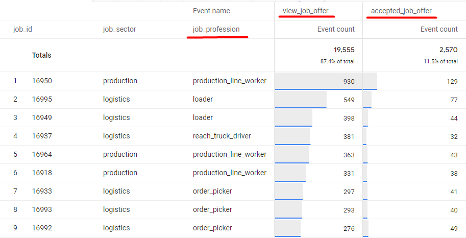 So, the custom events list was view_job_offer and accept_job_offer, with a couple of supplemental events like cancel_application and restart_application to get the complete picture of what’s happening on the website.