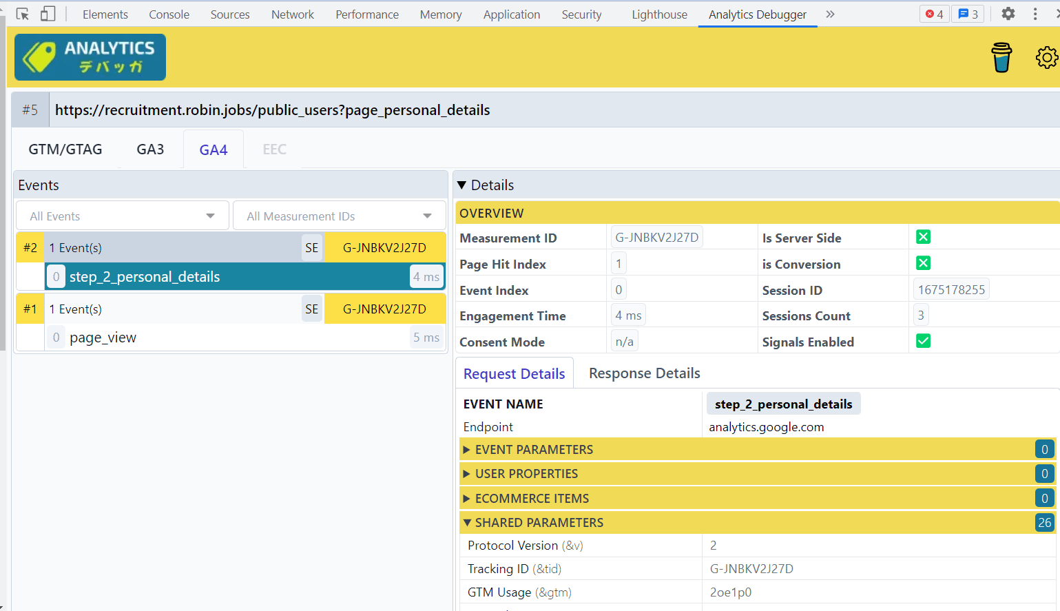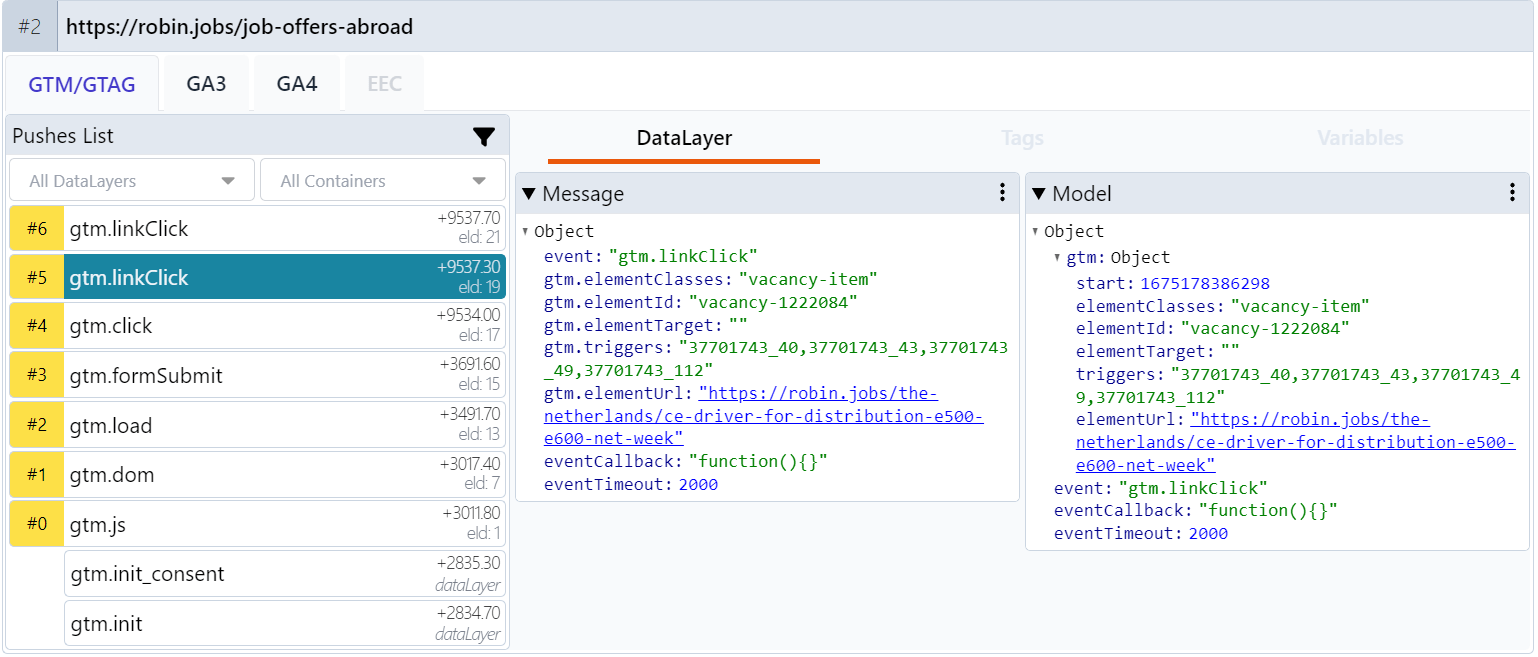 We used GA4 debugView and GTM preview mode as standard testing practices. We decided to supplement our testing process with the ‘Analytics Debugger’ Chrome extension and, finally, the ‘network’ segment of Chrome’s developer tools (available in all browsers).